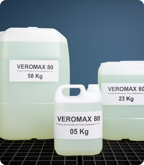 VEROMAX 80 (Dióxido de Cloro): Solução de grau alimentício, não corrosiva, que elimina bactérias e fungos em equipamentos, superfícies e água de processamento